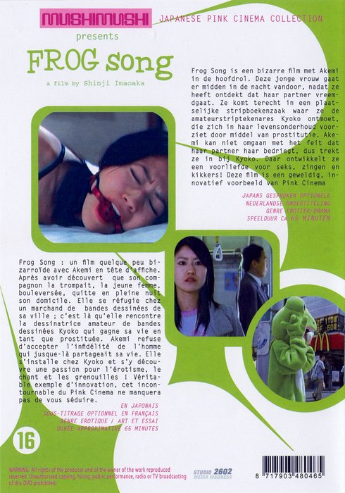 ![]() ![]() DVD front sleeve: Frog Song (NL) ![]() ![]() DVD back sleeve: Frog Song (NL) | DVD: "Frog Song" Mushimushi Frog Song is een bizarre film met Akemi in de hoofdrol. Deze jonge vrouw gaat er midden in de nacht vandoor, nadat ze heeft ontdekt dat haar partner vreemdgaat. Ze komt terecht in een plaatselijke stripboekenzaak waar ze de amateurstriptekenares Kyoko ontmoet, die zich in haar levensonderhoud voorziet door middel van prostitutie. Akemi kan niet omgaan met het feit dat haar partner haar bedriegt, dus trekt ze in my Kyoko. Daar ontwikkelt ze een voorliefde voor seks, zingen en kikkers! Deze film is een geweldig, innovatief voorbeeld van Pink Cinema. Country: NL Released: 23-APR-2008 by Studio 2602 Media Madness Release #: MM-10 Duration: 65 min. Aspect ratio: 1.78:1 Audio: Japanese: Dolby Digital: 2-Channel Stereo Subtitles: Dutch, English, French, German Extras: none DVD discs: 1 Regioncode: 2 Disc type: DVD5 Barcode: 8717903480465 |