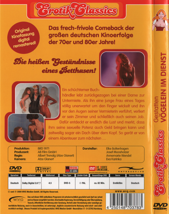![]() ![]() DVD front sleeve: gestatten Vögelein im Dienst (GER) ![]() ![]() DVD back sleeve: gestatten Vögelein im Dienst (GER) | DVD: "gestatten Vögelein im Dienst" Erotik Classics Ein schüchterner Buchhändler lebt zurückgezogen bei einer Dame zur Untermiete. Als ihn eine junge Dame völlig unerwartet um den Finger wickelt und ihn vor den Augen seiner Vermieterin verführt, verliert er sein Zimmer und schließlich auch seinen Job. Dafür entdeckt er endlich die Lust und während er auf stetiger Zimmer- und Arbeitsuche ist, merkt er, dass ihm seine sexuelle Potenz auch Geld bringen kann und zeitweilig sogar ein Dach über dem Kopf. So gerät er von einem Abenteuer zum nächsten… ![]() Country: GER Released: 13-FEB-2009 by WVG Medien GmbH Release #: 0378 Duration: 82 min. Aspect ratio: 4:3 Audio: German: Dolby Digital 2.0 Subtitles: none Extras: none DVD discs: 1 Regioncode: 2 Disc type: DVD5 Barcode: 4250148703783 |