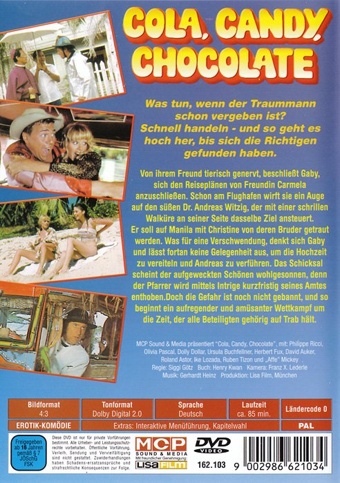![]() ![]() DVD front sleeve: Cola, Candy, Chocolate (GER) ![]() ![]() DVD back sleeve: Cola, Candy, Chocolate (GER) | DVD: "Cola, Candy, Chocolate" Was tun, wenn der Traummann schon vergeben ist? Schnell handeln - und so geht es hoch her, bis sich die Richtigen gefunden haben. ![]() Country: GER Released: 04-FEB-2007 by Lisa Film Release #: 162.103 Duration: 85 min. (= 78:00 !) Aspect ratio: 1.63:1 Audio: German: Dolby Digital 2.0 Subtitles: none Extras: none DVD discs: 1 Regioncode: 0 Disc type: DVD5 Disc statistics: 720x756 (768x576), 4:3, 25 fps, 1 audio, 0 subs Barcode: 9002986621034 |