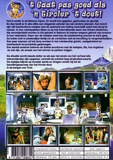 ![]() ![]() DVD front sleeve: 't Gaat Pas Goed Als 'n Tiroler 't Doet! (NL) ![]() ![]() DVD back sleeve: 't Gaat Pas Goed Als 'n Tiroler 't Doet! (NL) | DVD: "'t Gaat Pas Goed Als 'n Tiroler 't Doet!" Tiroler sex met een glimlach 15 Het is winter in de Beierse Alpen. Er wordt fors gegeten, gedronken en gevrijd. En dan landt er in alle stilte een vliegende schotel van een andere planeet. Aan boord zijn vijf beeldschone meisjes met de opdracht een lading mannelijk zaad mee terug te nemen. In hun ruimtepakken lijken ze op het internationale team van franse skisterren, die verondersteld worden in het geheim in Beieren te trainen wegens gebrek aan sneeuw in hun vaderland. Geen van de meisjes weet hoe de zaadwinning precies te werk gaat. Ze hullen zich in plaatselijke kledij om de contacten met de bevolking te vergemakkelijken. Een paar mannen uit het dorp worden in het ruimteschip gelokt, vastgeketend en mechanisch tot productie gedwongen. Een aantal anderen beleven de dolste avonturen met de meisjes, die, hoe argeloos ze ook zijn, de smaak van het minnen te pakken krijgen. Country: NL Release #: FUN760 Duration: 85 min. (= 79:05 !) Aspect ratio: 1.33:1 Audio: German: Dolby Digital 2.0 Mono Subtitles: Dutch DVD discs: 1 Regioncode: 2 Disc type: DVD5 Barcode: 8713982008842 Cut: Dutch 8mm film(?) version with fixed subtitles |