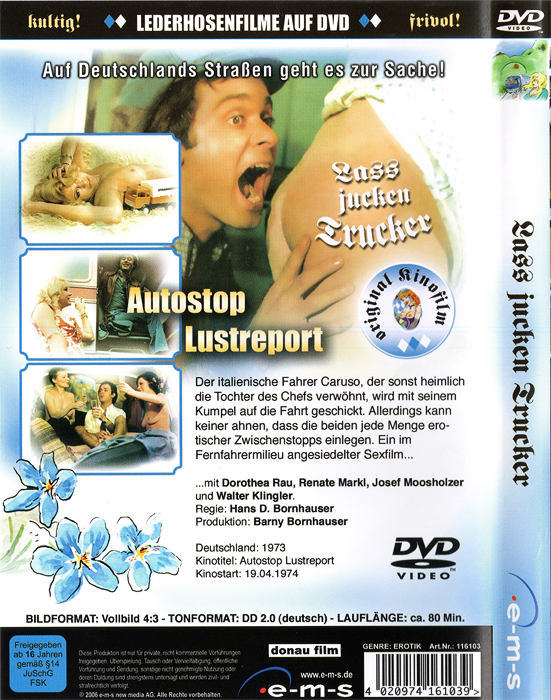 ![]() ![]() DVD front sleeve: Lass jucken Trucker (GER) ![]() ![]() DVD back sleeve: Lass jucken Trucker (GER) | DVD: "Lass jucken Trucker" Lederhosenfilme auf DVD Auf Deutschlands Straßen geht es zur Sache! ![]() Country: GER Released: 14-SEP-2006 by E-M-S, Donau Film Release #: 116103 Duration: 80 min. (= 72 min. !) Aspect ratio: 1.33:1 Audio: German: Dolby Digital 2.0 Mono Subtitles: none Extras: none DVD discs: 1 Regioncode: 2 Disc type: DVD5 Barcode: 4020974161039 Cut: Geänderte Fassung |