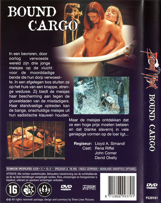 ![]() ![]() DVD front sleeve: Bound Cargo (NL) ![]() ![]() DVD back sleeve: Bound Cargo (NL) | DVD: "Bound Cargo" Bound Heat In een bevroren, door oorlog verwoeste wereld zijn dire jonge meisjes op de vlucht voor de moorddadige bende die hun dorp verwoestte. In een afgelegen bos sluiten ze op het huis van een knappe, strenge weduwe. Zij biedt de meisjes haar bescherming aan tegen de gruweldaden van de misdadigers. Haar standvastige optreden kan de bange, onschuldige meisjes uit hun sadistische klauwen houden. Maar de meisjes ontdekken dat ze een hoge prijs moeten betalen en dat de blanke slavernij in vele geniepige vormen op de loer ligt... Country: NL Released: 11-APR-2006 by Three Lines Pictures BV Release #: FS20161 Duration: 106 min. Audio: English: Dolby Digital 5.1 Subtitles: Dutch Extras: none DVD discs: 1 Regioncode: 2 Disc type: DVD5 Barcode: 8712806993791 |