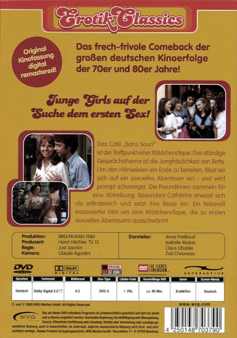 ![]() ![]() DVD front sleeve: Girls, die kleinen Aufreisserinnen (GER) ![]() ![]() DVD back sleeve: Girls, die kleinen Aufreisserinnen (GER) | DVD: "Girls, die kleinen Aufreisserinnen" Erotik Classics Das Café "Sans Souci" ist der Treffpunkt einer Mädchenclique. Gesprächsthema ist die Jungfräulichkeit von Betty. Um den Hänseleien ein Ende zu machen, lässt sie sich auf ein sexuelles Abenteuer ein - und wird prompt schwanger. Die Freundinnen sammeln für eine Abtreibung. Besonders Cathérine erweist sich als erfinderisch und setzt ihre Reize ein. Ein liebenvol inszenierter Film um eine Mädchenclique, die zu ersten sexuellen Abenteuer ausschwärmt. ![]() Country: GER Released: 13-FEB-2009 by WVG Medien GmbH Release #: 0379 Duration: 95 min. Aspect ratio: 4:3 Audio: German: Dolby Digital 2.0 Subtitles: none Extras: none DVD discs: 1 Regioncode: 2 Disc type: DVD5 Barcode: 4250148703790 |