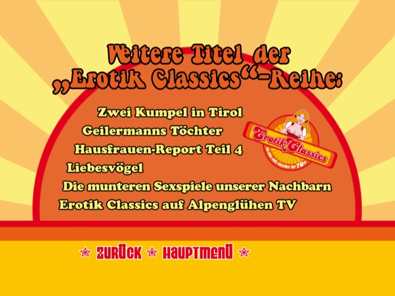 ![]() ![]() DVD front sleeve: Aus dem Tagebuch einer 17 jährigen (GER) ![]() ![]() DVD back sleeve: Aus dem Tagebuch einer 17 jährigen (GER) | DVD: "Aus dem Tagebuch einer 17 jährigen - Young Love, Hot Love" Erotik Classics Eine 17 jährige Teenagerin betrauert den Verlust ihres 38 jährigen Freundes, dem sie sich nach Überwindung ihrer Jugendliebe zugewandt hatte. Sie erlebt ein erotisches Abenteuer noch dem anderen - stets bemüht, ihren Trennungs- schmerz zu überwinden - und reift dabei vom einst schüchternen Mädchen zur erfahrenen Frau. Der Film - schonungslos gemacht- räumt mit allen Tabus auf und zeigt die sexuellen Wünsche der Frauen. ![]() Country: GER Released: 20-NOV-2009 by WVG Medien GmbH Release #: 0400 Duration: 72 min. (= 72:16 !) Aspect ratio: 1.30:1 (749x574) (4:3) Audio: German: Dolby Digital 2.0 Subtitles: none Extras: none DVD discs: 1 Regioncode: 2 Disc type: DVD5 Disc statistics: 720x576 (768x576), 4:3, 25 fps, 1 audio, 0 subs Barcode: 4250148704001 |