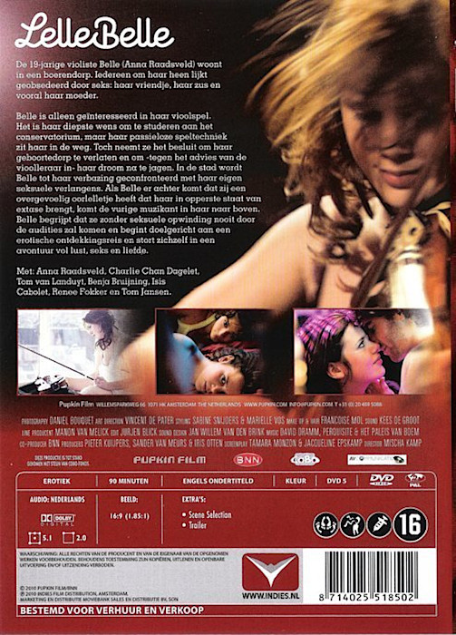 ![]() ![]() DVD front sleeve: LelleBelle (NL) ![]() ![]() DVD back sleeve: LelleBelle (NL) | DVD: "LelleBelle" De 19-jarige violiste Belle (Anna Raadsveld) woont in een boerendorp. Iedereen om haar heen lijkt geobsedeerd door seks: haar vriendje, haar zus en voorral haar moeder. Country: NL Released: 21-JAN-2011 by Indies Film Release #: 206971 DVD Duration: 90 min. (= 89:23 !) Aspect ratio: 1.78:1 (16:9 Anamorphic) Audio: Dutch: Dolby Digital 5.1, Dutch: Dolby Digital 2.0 Subtitles: English Extras: none DVD discs: 1 Regioncode: 2 Disc type: DVD5 Disc statistics: 720x576 (1024x576), 16:9, 25 fps, 2 audio, 1 subs Barcode: 8714025518502 |