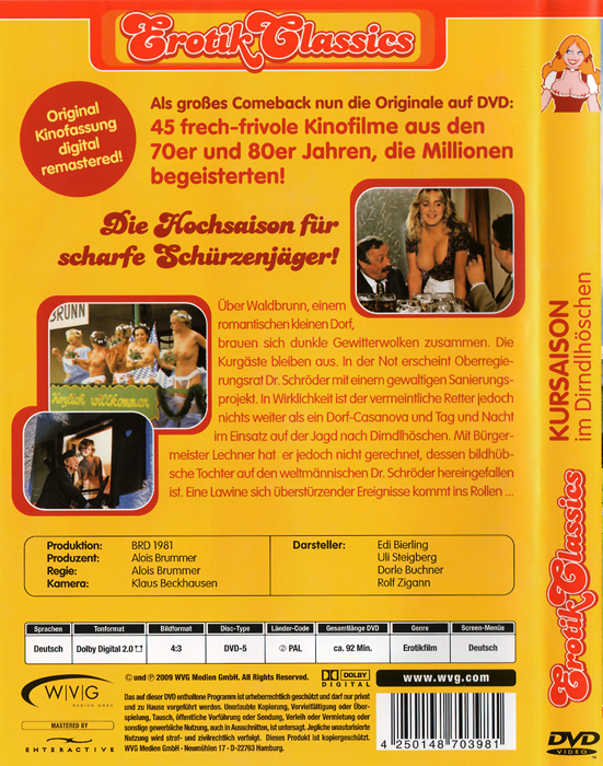 ![]() ![]() DVD front sleeve: Kursaison im Dirndlhöschen (GER) ![]() ![]() DVD back sleeve: Kursaison im Dirndlhöschen (GER) | DVD: "Kursaison im Dirndlhöschen" Erotik Classics Über Waldbrunn, einem romantischen kleinen Dorf, brauen sich dunkle Gewitterwolken zusammen. Die Kurgäste bleiben aus. In der Not erscheint Oberregierungsrat Dr. Schröder mit einem gewaltigen Sanierungsprojekt. In Wirklichkeit ist der vermeintliche Retter jedoch nichts weiter als ein Dorf- Casanova und Tag und Nacht im Einsatz auf der Jagd nach Dirndlhöschen. Mit Bürgermeister Lechner hat er jedoch nicht gerechnet, dessen bildhübsche Tochter auf den weltmännischen Dr. Schröder hereingefallen ist. Eine Lawine sich überstürzender Ereignisse kommt ins Rollen... ![]() Country: GER Released: 20-NOV-2009 by WVG Medien GmbH Release #: 0398 Duration: 92 min. (= 91:37 !) Aspect ratio: 1.29:1 (740x576) (4:3) Audio: German: Dolby Digital 2.0 Subtitles: none Extras: none DVD discs: 1 Regioncode: 2 Disc type: DVD5 Disc statistics: 720x576 (768x576), 4:3, 25 fps, 1 audio, 0 subs Barcode: 4250148703981 |