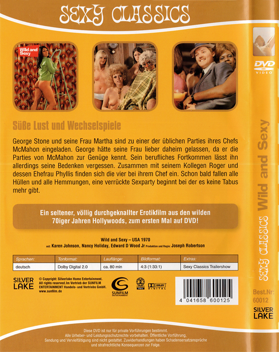 ![]() ![]() DVD front sleeve: Wild and Sexy (GER) ![]() ![]() DVD back sleeve: Wild and Sexy (GER) | DVD: "Wild and Sexy" Sexy Classics Eine seltener, völlig durchgeknallter Erotikfilm aus den wilden 70 Jahren Hollywoods, zum ersten Mal auf DVD! ![]() Country: GER Released: 16-OCT-2009 by Silverlake Home Entertainment Release #: 60012 Duration: 80 min. (= 70:24 !) Aspect ratio: 1.33:1 Audio: German: Dolby Digital 2.0 Mono Subtitles: none Extras: none DVD discs: 1 Regioncode: 2 Disc type: DVD5 Barcode: 4041658600125 Cut |