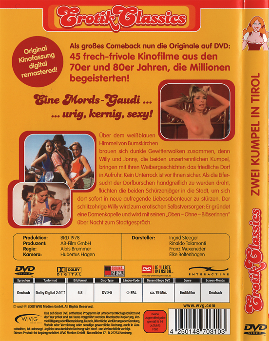 ![]() ![]() DVD front sleeve: Zwei Kumpel in Tirol (GER) ![]() ![]() DVD back sleeve: Zwei Kumpel in Tirol (GER) | DVD: "Zwei Kumpel in Tirol" Erotik Classics Über dem weißblauen Himmel von Bumskirchen brauen sich dunkle Gewitterwolken zusammen, denn Willy und Jonny, die beiden unzertrennlichen Kumpel, bringen mit ihren Weibergeschichten das friedliche Dorf in Aufruhr. Kein Unterrock ist vor Ihnen sicher. Als die Eifersucht der Dorfburschen handgreiflich zu werden droht, flüchten die beiden Schürzenjäger in die Stadt, um sich dort sofort in neue aufregende Liebesabenteuer zu stürzen. Der schlitzohrige Willy wird zum erotischen Selbstversorger: Er gründet eine Damenkapelle und wird mit seinen Oben-Ohne-Bläserinnen über Nacht zum Stadtgespräch. ![]() Country: GER Released: 22-AUG-2008 by WVG Medien GmbH Release #: 0310 Duration: 79 min. Aspect ratio: 4:3 Audio: German: Dolby Digital 2.0 Subtitles: none Extras: none DVD discs: 1 Regioncode: 2 Disc type: DVD5 Barcode: 4250148703103 |