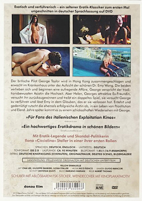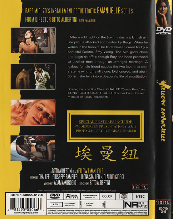 ![]() ![]() DVD front sleeve: Yellow Emanuelle (USA) ![]() ![]() DVD back sleeve: Yellow Emanuelle (USA) | DVD: "Yellow Emanuelle" Ilona Staller After a wild night on the town, a dashing British airline pilot is attacked and beaten by thugs. When he wakes in the hospital he finds himself cared for by a beautiful Doctor, Emy Wong. The two grow close and begin an affair, though Emy has been promised to another man through an arranged marriage. A jealous female friend causes the two lovers to separate, leaving Emy all alone. Dishonored, and abandoned, she falls into a desperate life of prostitution. Rating: NR Country: USA Released: 5-APR-2005 by Kitty Media Release #: EDDVD 0506 Duration: 80 min. Aspect ratio: 1.85:1 (16:9 Anamorphic) Audio: English: Dolby Digital 2.0 (mono) Subtitles: none Extras: Trailer, Photogallery DVD discs: 1 Regioncode: 1 Disc type: DVD5 Barcode: 631595050660 |