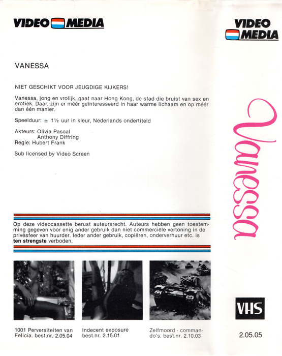 ![]() ![]() VHS front sleeve: Vanessa (NL) ![]() ![]() VHS back sleeve: Vanessa (NL) | VHS: "Vanessa" Niet geschikt voor jeugdige kijkers! Country: NL Released: by Video Media Release #: 2.05,05 Duration: 90 min. Subtitles: Dutch |