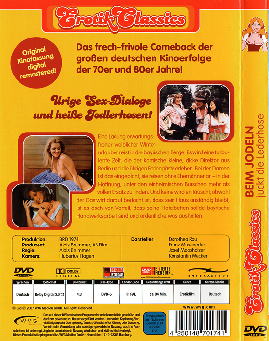 ![]() ![]() DVD front sleeve: Beim Jodeln juckt die Lederhose (GER) ![]() ![]() DVD back sleeve: Beim Jodeln juckt die Lederhose (GER) | DVD: "Beim Jodeln juckt die Lederhose" Erotik Classics Eine Ladung erwartungsfroher weiblicher Winterurlauber reist in die bayrischen Berge. Es wird eine turbulente Zeit, die der komische kleine, dicke Direktor aus Berlin und die übrigen Fahrgäste erleben. Bei den Damen ist das eingeplant, sie reisen ohne Ehemänner an - in der Hoffnung, unter den einheimischen Burschen mehr als vollen Ersatz zu finden. Und keine wird enttäuscht, obwohl der Gastwirt darauf bedacht ist, dass sein Haus anständig bleibt, ist es doch von Vorteil, dass seine Hotelbetten solide bayrische Handwerksarbeit sind und ordentliche was aushalten. ![]() Country: GER Released: 23-NOV-2007 by WVG Medien GmbH Release #: 0174 Duration: 84 min. (= 81:26 !) Aspect ratio: 1.61:1 (747x464) (4:3) Audio: German: Dolby Digital 2.0 Subtitles: none Extras: none DVD discs: 1 Regioncode: 2 Disc type: DVD5 Disc statistics: 720x576 (768x576), 4:3, 25 fps, 1 audio, 0 subs Barcode: 4250148701741 |