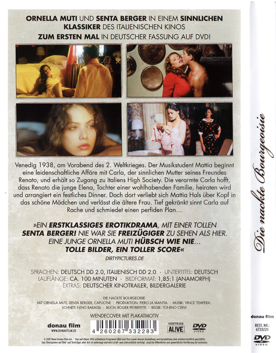 ![]() ![]() DVD front sleeve: Die nackte Bourgeoisie (GER) ![]() ![]() DVD back sleeve: Die nackte Bourgeoisie (GER) | DVD: "Nackte Bourgeoisie, Die" Donau Film Venedig 1938, am Vorabend des 2. Weltkrieges. Der Musikstudent Mattia beginnt eine leidenschaftliche Affäre mit Carla, der sinnlichen Mutter seines Freundes Renato, und erhält so Zugang zu Italiens High Society. Die verarmte Carla hofft, dass Renato die junge Elena, Tochter einer wohlhabenden Familie, heiraten wird und arrangiert ein festliches Dinner. Doch dort verliebt sich Mattia Hals über Kopf in das schöne Mädchen und verlässt die ältere Frau. Tief gekränkt sinnt Carla auf Rache und schmiedet einen perfiden Plan... ![]() Country: GER Released: 26-MAY-2017 by Donau Film Release #: 6733228 Duration: 100 min. (= 100:42 !) Aspect ratio: 1.89:1 (16:9 Anamorphic) Audio: Italian: Dolby Digital 2.0, German: Dolby Digital 2.0 Subtitles: German Extras: German cinema trailer, Photogallery DVD discs: 1 Disc type: DVD5 Disc statistics: 720x576 (1024x576), 16:9, 25 fps, 2 audio, 1 subs Barcode: 4260267332283 Slipcase with removable FSK-sticker, Wendecover with movieposter design |
