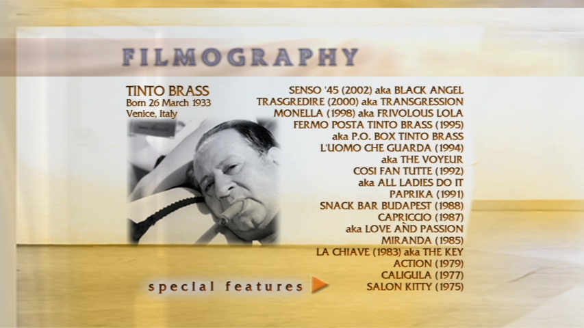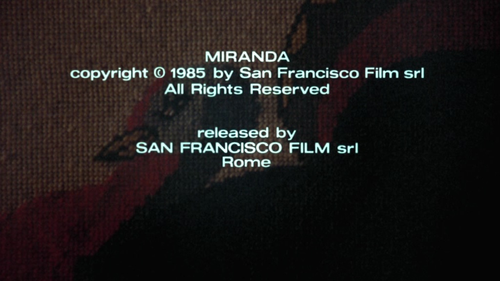 ![]() ![]() DVD front sleeve: Miranda (USA) ![]() ![]() DVD back sleeve: Miranda (USA) | DVD: "Miranda" While waiting years for her MIA husband to return, Miranda continues to manage their pension in a serene country village. Into this picture enter a bartender, and old fascist council, a young truck driver, and an American ex-soldier, who all soon come to be Miranda's admirers. Serena Grandi, for playing the lead role in this wildly popular film, was voted the sexiest woman in Italy. Rating: Unrated (NR) Country: USA Released: 31-AUG-2004 by Cult Epics Release #: DVD012 Edition: Special Edition Duration: 95 min. (= 94:59 !) Aspect ratio: 1.84:1 (853x464) (16:9) Anamorphic Audio: English: Dolby Digital 2.0 Extras: Interview Tinto (2002) (10min), Photogallery, Trailers, Filmography DVD discs: 1 Disc type: DVD5 Disc statistics: 720x480 (853x480), 16:9, 25 fps, 1 audio, 0 subs Barcode: 881190001295 Englsih language version, uncensored, NTSC |