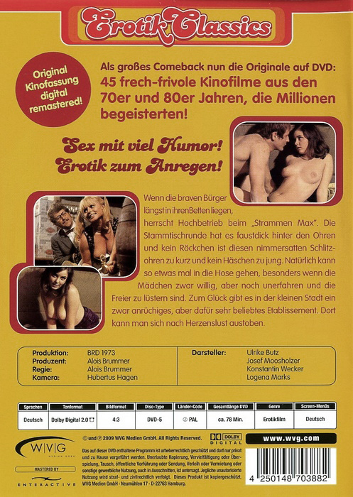 ![]() ![]() DVD front sleeve: Geilermanns Töchter (GER) ![]() ![]() DVD back sleeve: Geilermanns Töchter (GER) | DVD: "Geilermanns Töchter" Erotik Classics Wenn die braven Bürger längst in ihren Betten liegen, herrscht Hochbetrieb beim „Strammen Max“. Die Stammtischrunde hat es faustdick hinter den Ohren und kein Röckchen ist diesen nimmersatten Schlitzohren zu kurz und kein Häschen zu jung. Natürlich kann so etwas mal in die Hose gehen, besonders wenn die Mädchen war willig, aber noch unerfahren und die Freier zu lüstern sind. Zum Glück gibt es in der kleinen Stadt ein zwar anrüchiges, aber dafür sehr beliebtes Etablissement. Dort kann man sich nach Herzenslust austoben ![]() Country: GER Released: 21-AUG-2009 by WVG Medien GmbH Release #: 0388 Duration: 78 min. Aspect ratio: 4:3 Audio: German: Dolby Digital 2.0 Subtitles: none Extras: none DVD discs: 1 Regioncode: 2 Disc type: DVD5 Barcode: 4250148703882 |