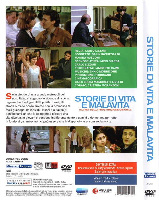 ![]() ![]() DVD front sleeve: Storie di vita e malavita (ITA) ![]() ![]() DVD back sleeve: Storie di vita e malavita (ITA) | DVD: "Storie di vita e malavita" Ilona Staller Sullo sfondo di una grande metropoli del nord Italia, si seguono le vicende di alcune ragazze finite nel giro della prostituzione, da strada o dall'alto bordo. Irretite con la promessa di facili guadagni da individui loschi o a causa di conflitti familiari che le spingono a cercare una vita diversa, le giovani si vendono indifferentemente a uomini e donne: ma per tutte in fondo al cammino, non ci può essere che la disperazione e spesso, la morte. Rating: 18 Country: ITA Released: 21-NOV-2012 by Minerva Pictures/ RaroVideo Release #: 04272 Duration: 117 min. Aspect ratio: 1.78:1 Audio: Italian: Dolby Digital mono Subtitles: none Extras: Documentary"La baby prostitute", Photogallery DVD discs: 1 Disc type: DVD9 Barcode: 8032807042725 |