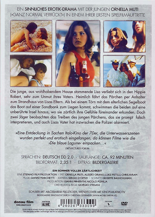 ![]() ![]() DVD front sleeve: Ein Sommer voller Zärtlichkeit (GER) ![]() ![]() DVD back sleeve: Ein Sommer voller Zärtlichkeit (GER) | DVD: "Sommer voller Zärtlichkeit, Ein" Donau Film Die junge, aus wohlhabendem Hause stammende Lisa verliebt sich in den Hippie Robert, sehr zum Unmut ihres Vaters. Heimlich fährt das Pärchen per Anhalter zum Strandhaus von Lisas Eltern. Als bei einem Törn mit dem elterlichen Segelboot das Boot auf einer Sandbank zum Liegen kommt, schwimmen die beiden auf eine unberührte Insel hinaus, wo sie zärtlich ihre Gefühle füreinander erkunden. Doch zwei Jäger beobachten das Treiben des jungen Pärchens, das sie prompt falsch interpretieren, und auch Lisas Vater hat inzwischen die Polizei alarmiert. ![]() Country: GER Released: 26-APR-2019 by Donau Film Release #: 6733309 Duration: 92 min. Aspect ratio: 2.35:1 Audio: German: Dolby Digital 2.0 Subtitles: none Extras: Photogallery DVD discs: 1 Disc type: DVD5 Barcode: 4260267333099 Slipcase with removable FSK-sticker, Wendecover with movieposter design |