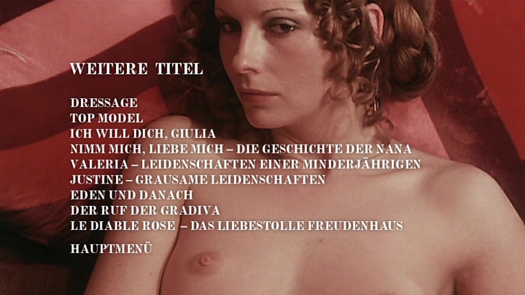 ![]() ![]() DVD front sleeve: 11.000 Rutten (GER) ![]() ![]() DVD back sleeve: 11.000 Rutten (GER) | DVD: "11.000 Rutten - Im Rausch der Sinne" Donau Film Der leitende Bankangestellte Romain Marchand ist an seinem Arbeitsplatz tagaus tagein von Scharen blonder, leichtgeschürzter Traumfrauen umgeben, so dass sein geplagter Geist vor erotischen Phantasien nur so überquillt. Als er im Nachlass seiner Familie alte Filmrollen findet, verschwimmen die Grenzen zwischen Traum und Realität. In der Person seines verstorbenen Onkels, eines Prinzen, durchlebt er wilde Orgien, Skandale und ausschweifende Exzesse. Im legendären Orient Express, in einem Luxushotel in Budapest, im Bordell und an der Kriegsfront - überall findet er willige Frauen für seine ausgefallenen erotischen Spiele zwischen Lust und Schmerz. ![]() Country: GER Released: 23-SEP-2016 by Donau Film Release #: 6733185 Edition: Ungeschnitten (Uncut) Duration: 94 min. (= 93:47 !) Aspect ratio: 1.77:1 (16:9 Anamorphic) Audio: French: Dolby Digital 2.0, DVD: German: Dolby Digital 2.0 Subtitles: German Extras: none DVD discs: 1 Disc type: DVD5 Disc statistics: 720x576 (1024x576), 16:9, 25 fps, 2 audio, 1 subs Barcode: 4260267331859 Slipcase with removable FSK-sticker, Wendecover with movieposter design |