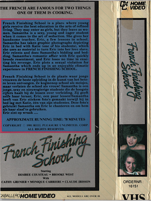 ![]() ![]() VHS front sleeve: French Finishing School (NL) ![]() ![]() VHS back sleeve: French Finishing School (NL) | VHS: "French Finishing School" French Finishing School is de plaats waar jonge vrouwen de beste opleiding in de kunst van het betere leven ontvangen. Ze komen op school als meisjes, maar verlaten de school als vrouw! Samantha is eenjonge, sexy en nieuwsgierige studente die de hoogste cijfers haalt bij de lessen over verleiding. Zij geeft zelfs haar leraar, Eric, een paar lessen! Samantha heeft van Eric stiekem foto's gemaakt terwijl hij in bed lag met Katie, één van zijn studentes. Deze foto's gebruikt Samantha om Eric te chanteren en om hem als haar slaaf te gebruiken. Eric zint op wraak... Country: NL Released: by Videorama/ Cabellero Home Video Release #: 16151 Duration: 78 min. Subtitles: Dutch Extras: none VHS tapes: 1 |