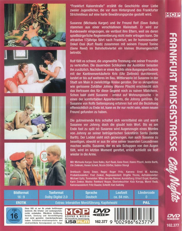 ![]() ![]() DVD front sleeve: Frankfurt Kaiserstraße (GER) ![]() ![]() DVD back sleeve: Frankfurt Kaiserstraße (GER) | DVD: "Frankfurt Kaiserstraße - City Nights" Frankfurt Kaiserstraße erzählt die Geschichte einer Liebe zweier Jugendlicher, die vor dem Hintergrund des Frankfurter Strichmilieus auf eine harte Bewährungsprobe gestellt wird. ![]() Country: GER Released: 13-APR-2018 by MCP Sound & Media Release #: 162.377 Duration: 84 min. (= 83:56 !) Aspect ratio: 1.85:1 (16:9 Anamorphic) Audio: German: Dolby Digital 2.0 Subtitles: none Extras: none DVD discs: 1 Regioncode: 0 Disc type: DVD5 Disc statistics: 720x576 (1024x576), 16:9, 25 fps, 1 audio, 1 subs Barcode: 9002986623779 |