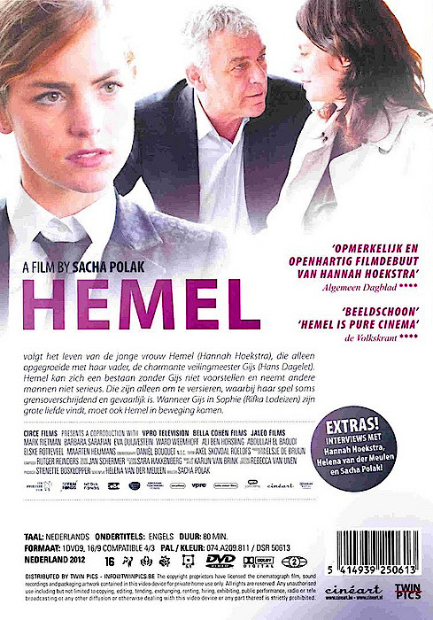 ![]() ![]() DVD front sleeve: Hemel (NL) ![]() ![]() DVD back sleeve: Hemel (NL) | DVD: "Hemel" HEMEL volgt het leven van de jonge vrouw Hemel (Hannah Hoekstra), die alleen opgegroeide met haar vader, de charmante veilingmeester Gijs (Hans Dagelet). Hemel kan zich een bestaan zonder Gijs niet voorstellen en neemt andere mannen niet serieus. Die zijn alleen om te versieren, waarbij haar spel soms grensoverschrijdend en gevaarlijk is. Wanneer Gijs in Sophie (Rifka Lodeizen) zijn grote liefde vindt, moet ook Hemel in beweging komen. Country: NL Released: 2012 by Cinéart Release #: DSR 50613 Duration: 80 min. Aspect ratio: 16:9 Audio: Dutch: Dolby Digital 5.1 Subtitles: English Extras: Interviews DVD discs: 1 Regioncode: 2 Disc type: DVD5 Barcode: 5414939250613 |
